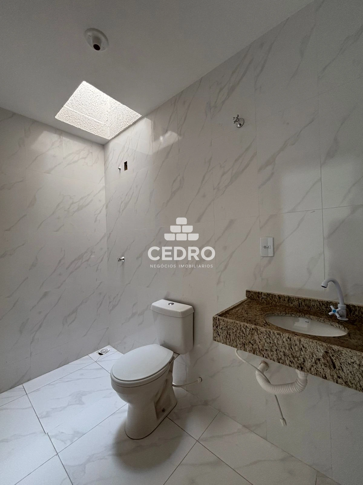 - Banheiro social revestido de porcelanato e com clarabóia;
